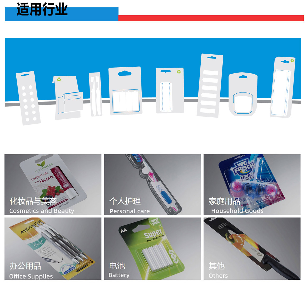 我們專業(yè)生產(chǎn)全自動紙塑(吸塑)包裝機,牙刷吸塑包裝機,電池掛卡包裝機,吸塑機等系列產(chǎn)品和多機智能聯(lián)動生產(chǎn)線及其相關(guān)配套設(shè)備。公司集生產(chǎn)、研發(fā)、銷售、售后為一體的企業(yè)。該產(chǎn)品適用于小五金(堿性電池、紐扣電池、膠水)、文具(卷筆刀、橡皮擦、涂改液、固體膠)、汽摩配(剎車片,雨刮片)、日用品(剃須刀、牙刷、牙線)、化妝品(唇膏,指甲刀,香水)、藥品(紅花油、風(fēng)油精,)、玩具(小汽車,指尖陀螺,手表)、醫(yī)療器械、食品、等行業(yè)相關(guān)產(chǎn)品的紙塑包裝。