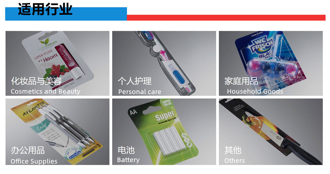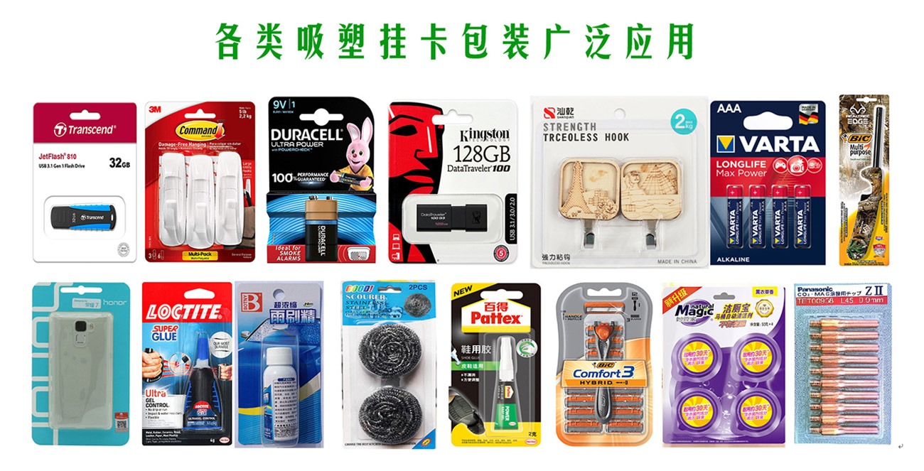 我們專業生產全自動紙塑(吸塑)包裝機,牙刷吸塑包裝機,電池掛卡包裝機,吸塑機等系列產品和多機智能聯動生產線及其相關配套設備。公司集生產、研發、銷售、售后為一體的企業。該產品適用于小五金(堿性電池、紐扣電池、膠水)、文具(卷筆刀、橡皮擦、涂改液、固體膠)、汽摩配(剎車片,雨刮片)、日用品(剃須刀、牙刷、牙線)、化妝品(唇膏,指甲刀,香水)、藥品(紅花油、風油精,)、玩具(小汽車,指尖陀螺,手表)、醫療器械、食品、等行業相關產品的紙塑包裝。